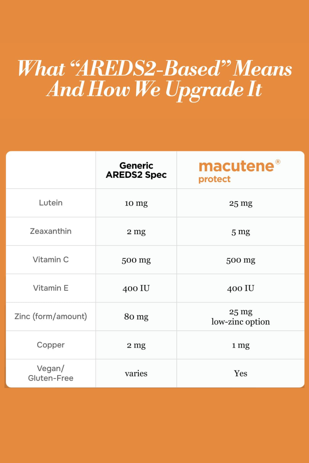 Macutene® Protect is a nature-based dietary supplement designed to specifically support the macula and retina. It contains all of the ingredients used in the AREDS2 clinical trial and also has additional lutein, zeaxanthin, meso-zeaxanthin, bilberry, green tea, and quercetin at optimal levels for macular and retinal health. Macutene Protect is a certified vegan, certified gluten-free, and non-GMO supplement that has been certified by independent lab to ensure quality, purity, and potency of ingredients.
